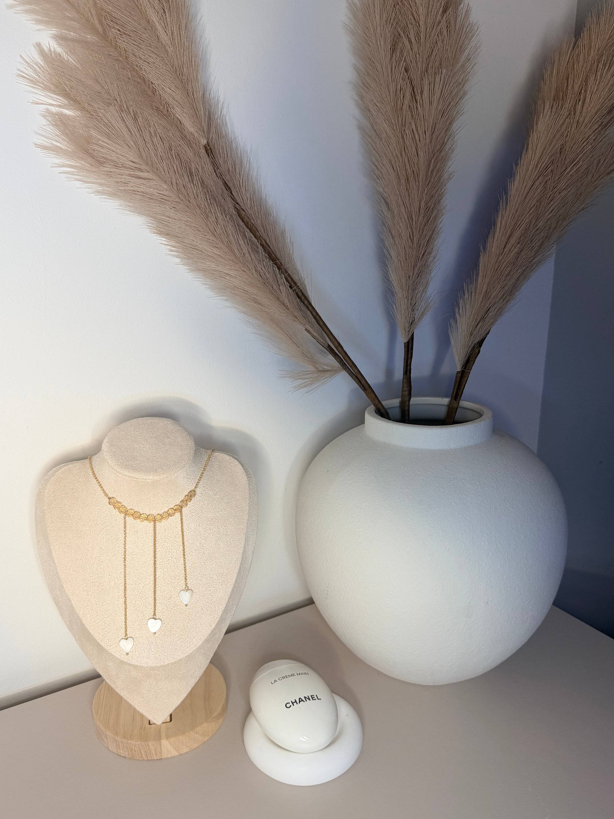 A delicate necklace that catches the eye with its subtle glow and romantic character. Three hearts made of natural mother-of-pearl hang irregularly along the chain, creating a light, dynamic effect with every movement.