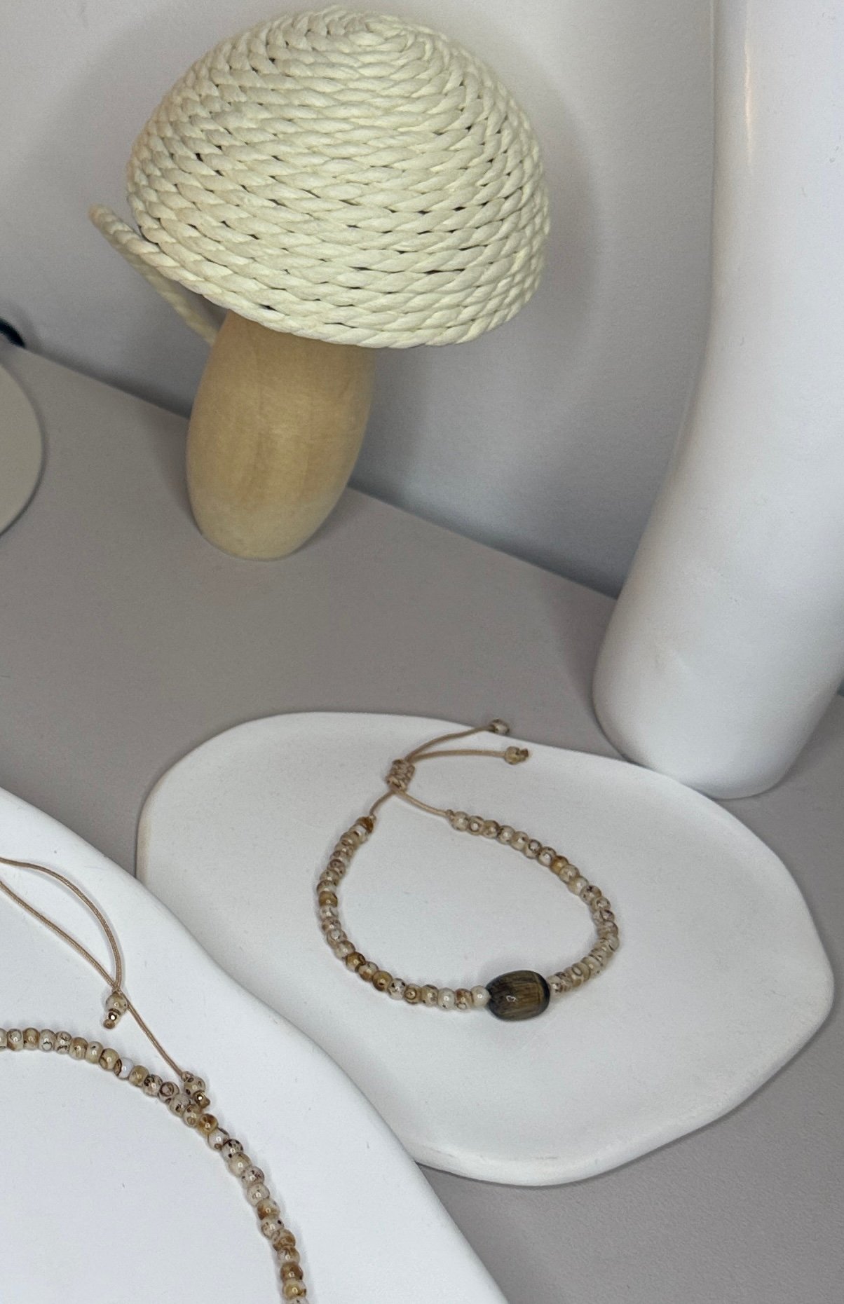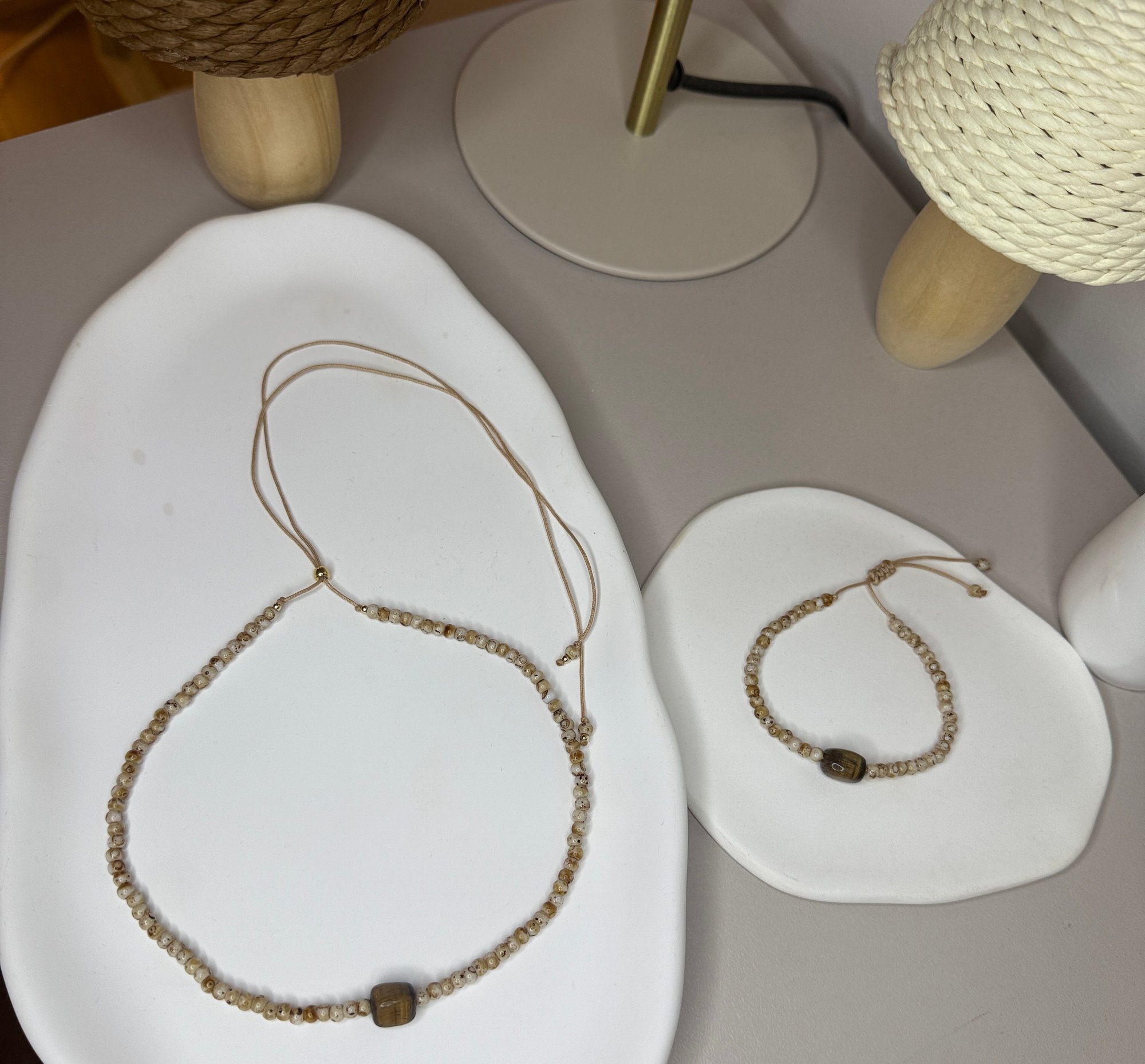 A subtle and elegant bracelet •BeigeLove•made of small, beige glass beads, forming a delicate and neutral base. The centerpiece of the design is a large tiger’s eye stone, whose golden-brown hues and characteristic “cat’s eye” effect catch the light and add striking yet natural beauty. Its simple, minimalist design makes the necklace extremely versatile – perfect for both everyday wear and more elegant outfits.