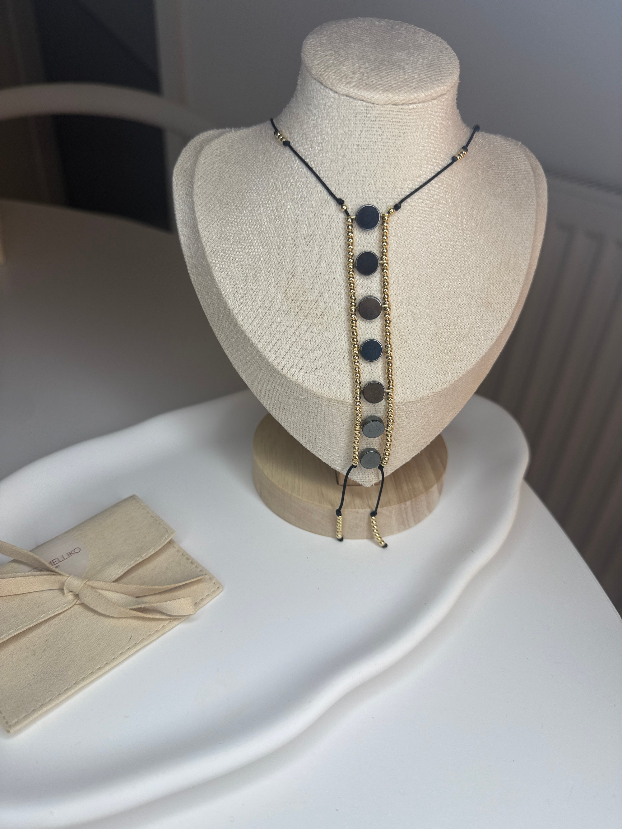 Naszyjnik •BSunPro• to wyjątkowa kompozycja naturalnego hematytu, osadzonego na delikatnym czarnym sznurku z subtelnymi złotymi akcentami. Kontrast między głęboką, grafitową barwą hematytu a blaskiem złota nadaje biżuterii unikalnego charakteru i wyrafinowania.