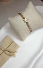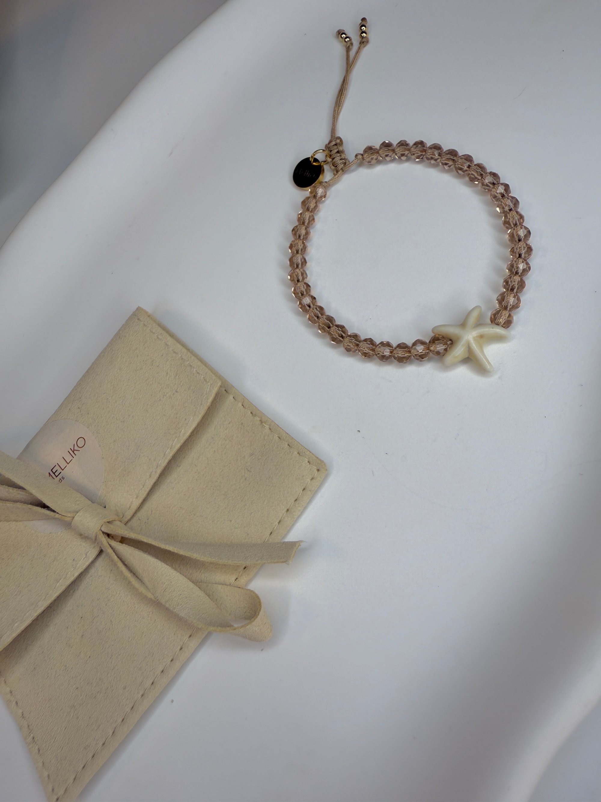 This bracelet, crafted entirely from tiny, beige beads, exudes beach charm. Its central feature is a charming starfish—yet understated, adding a nautical touch. It's visibly attached to a light cord with a macramé-style clasp, ensuring comfort and accessibility for any wrist. It's the perfect complement to nature, summer, and a subtle touch of boho style.