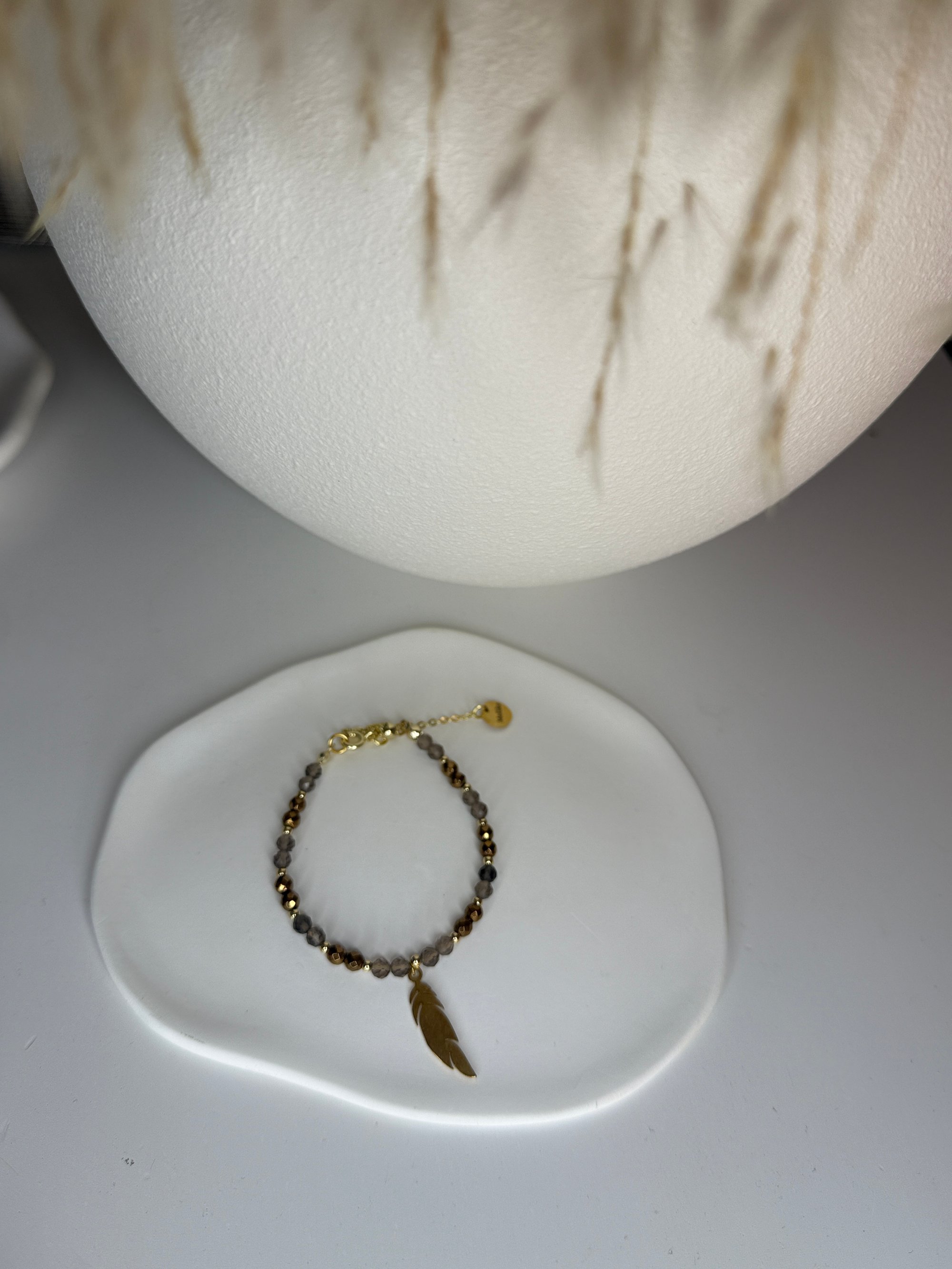 🇬🇧A bracelet made of smoky quartz and brown hematite, complemented by a decorative feather charm. The natural stones create a subtle yet distinctive composition – smoky quartz brings harmony and protection, while hematite adds strength and stability.