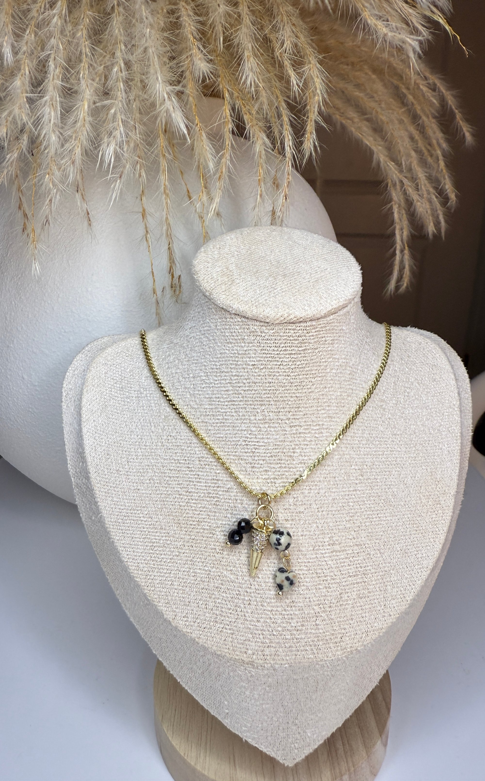 🇬🇧A necklace on a thicker, line-like chain, adorned with unique charms: black tourmaline, jasper, and an eye-catching cone-shaped pendant set with tiny diamonds. The whole design comes together in a bold yet harmonious composition.
