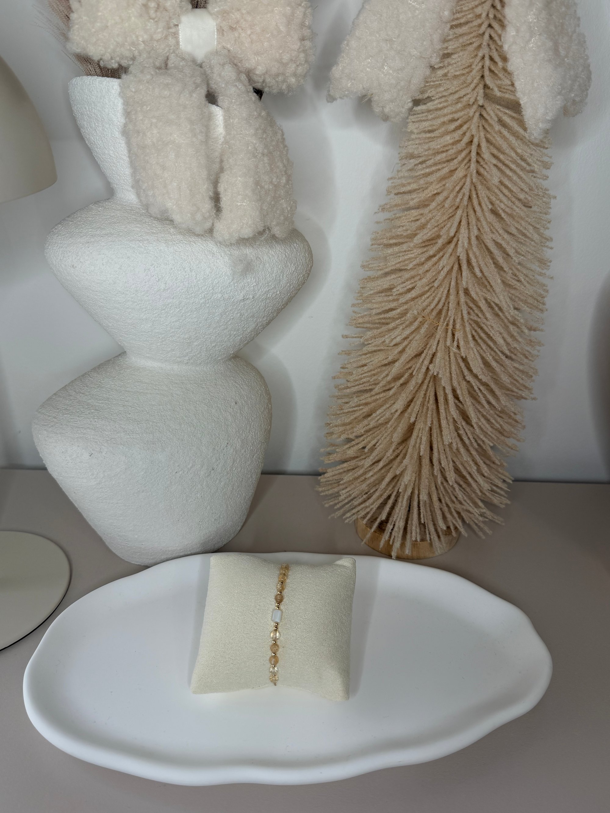 Zapięcie typu makrama umożliwia wygodną regulację, dzięki czemu bransoletka dopasowuje się do każdego nadgarstka. Lekka, minimalistyczna i elegancka – świetnie sprawdzi się zarówno na co dzień, jak i jako dodatek do bardziej wyrafinowanych stylizacji.