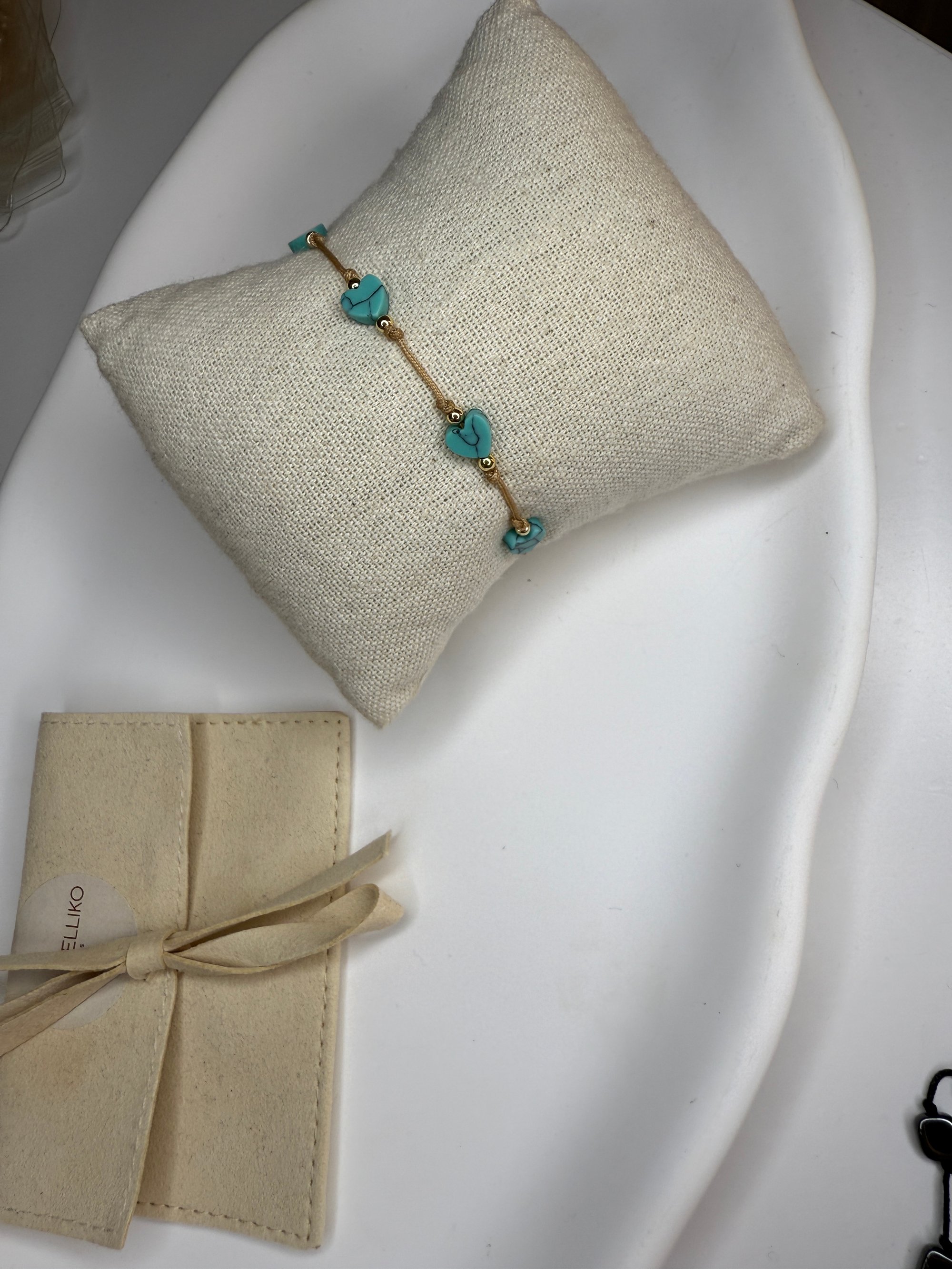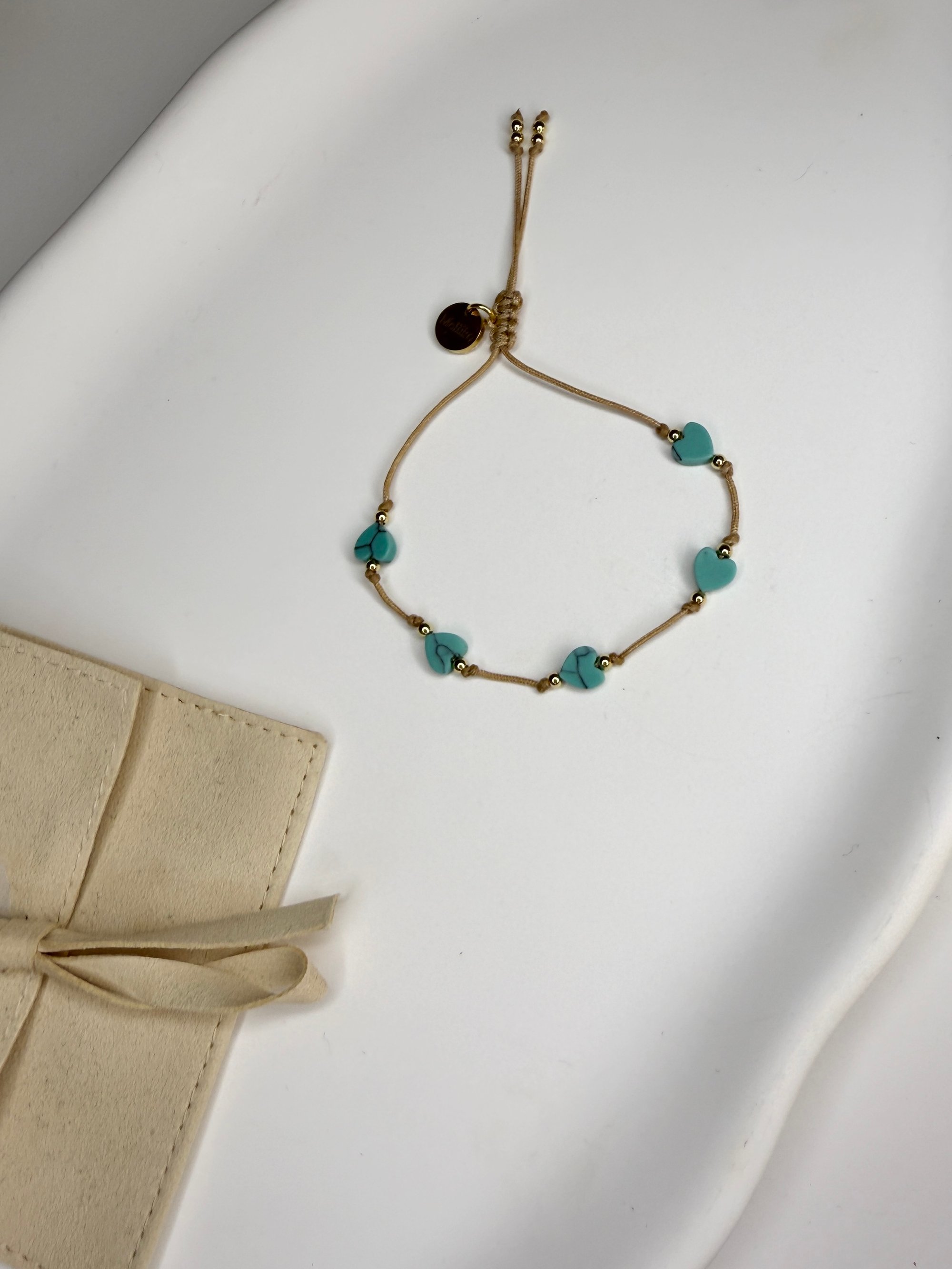 This delicate bracelet, made on a light-colored cord, enchants with its subtle and feminine charm. Its main decoration consists of small natural turquoise hearts that add a touch of freshness and color, symbolizing joy and lightness. The design is complemented by golden accents, which bring elegance and create a harmonious contrast with the cool turquoise. The adjustable closure makes the bracelet comfortable and versatile – a perfect everyday accessory.