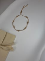 The bracelet made of beige string stands out with its subtle design. Its delicacy is emphasized by transparent beige beads and small golden accents that add elegance. The adjustable closure allows for a perfect fit on the wrist, making it both a practical and stylish accessory for everyday wear or special occasions.