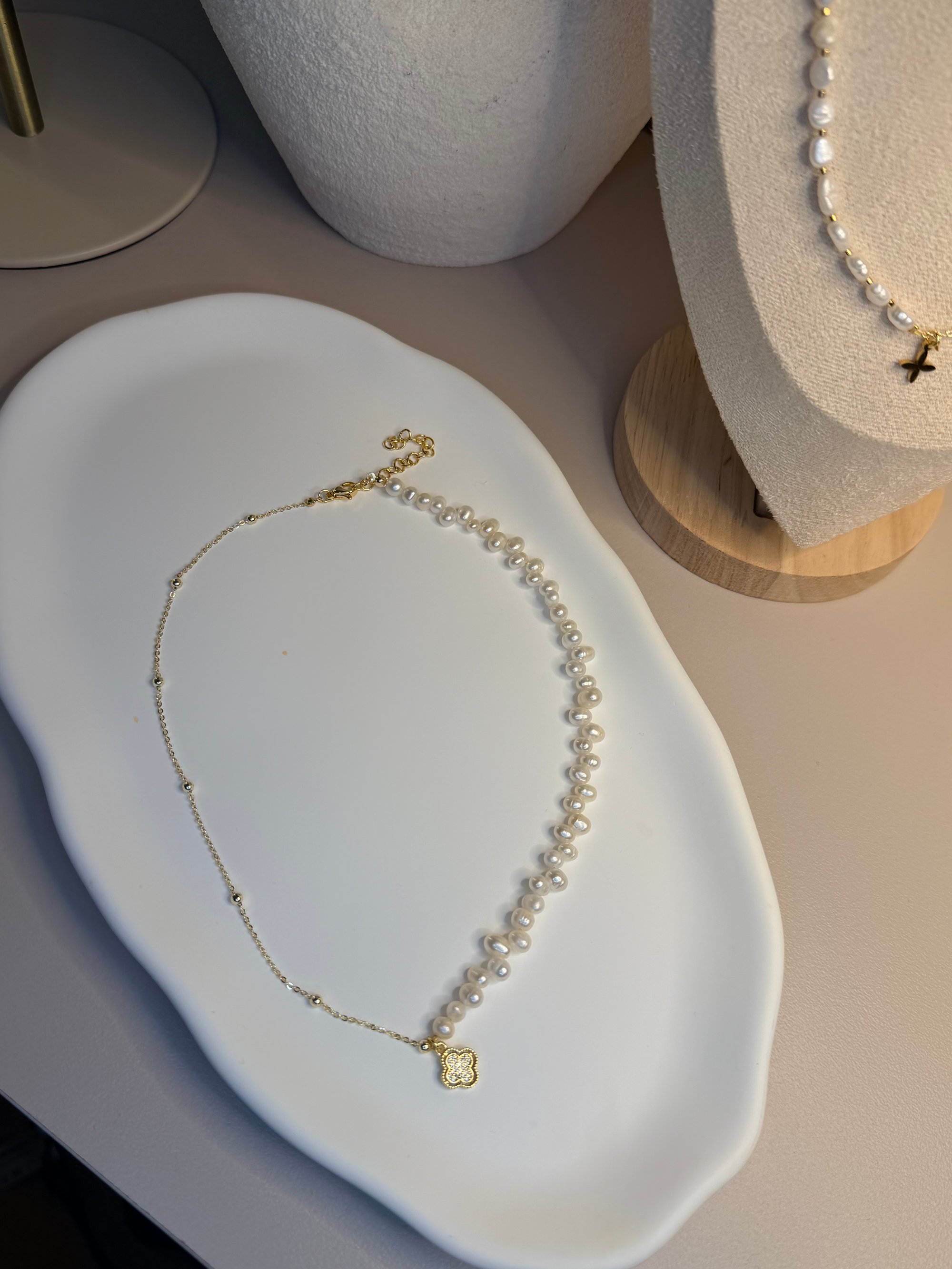A necklace with tiny pearls combined with a delicate chain and a minimalist pendant is the perfect blend of classic elegance and modern lightness. Feminine, refined, and wonderfully versatile — it beautifully complements both everyday outfits and special-occasion looks.