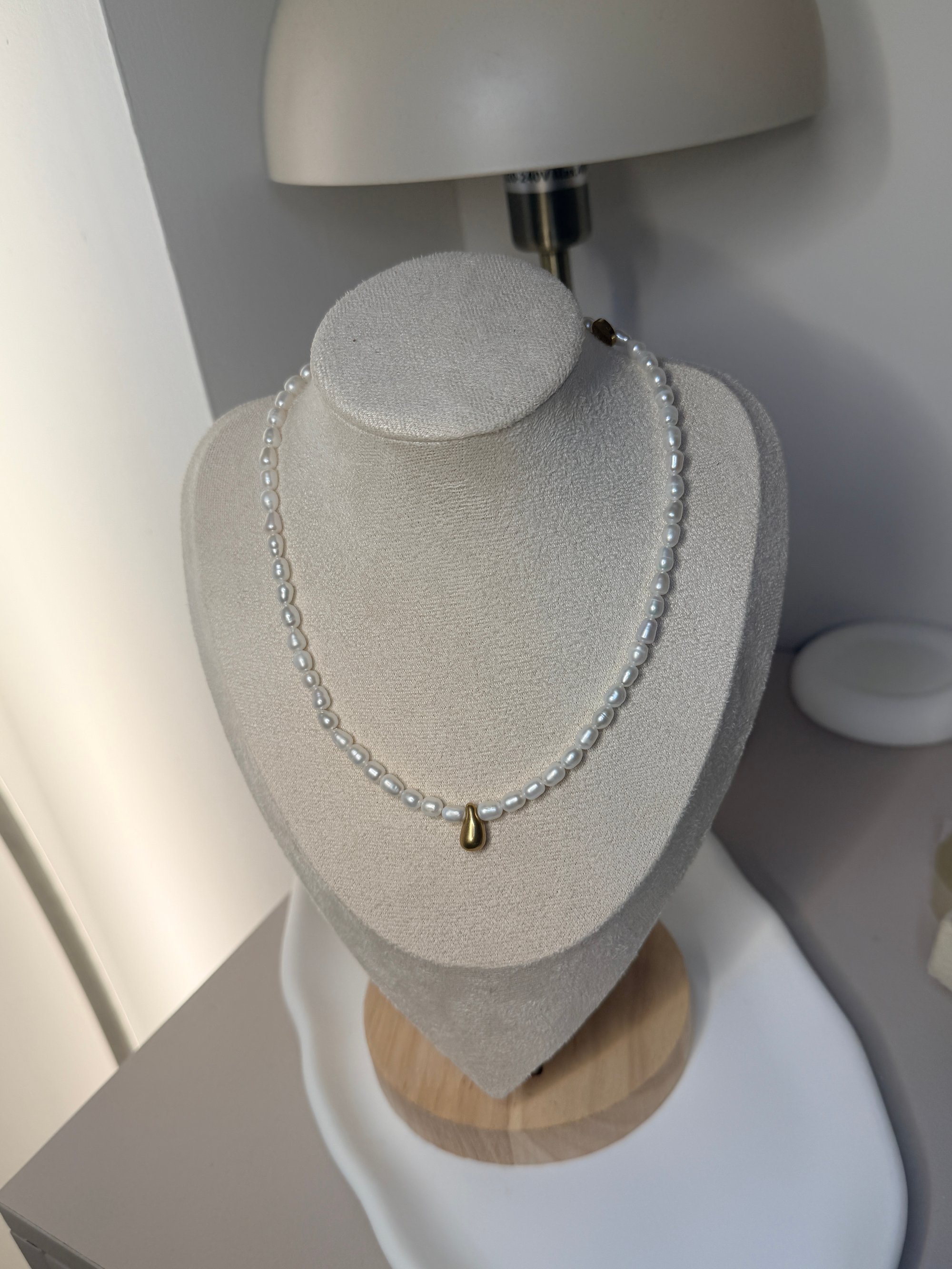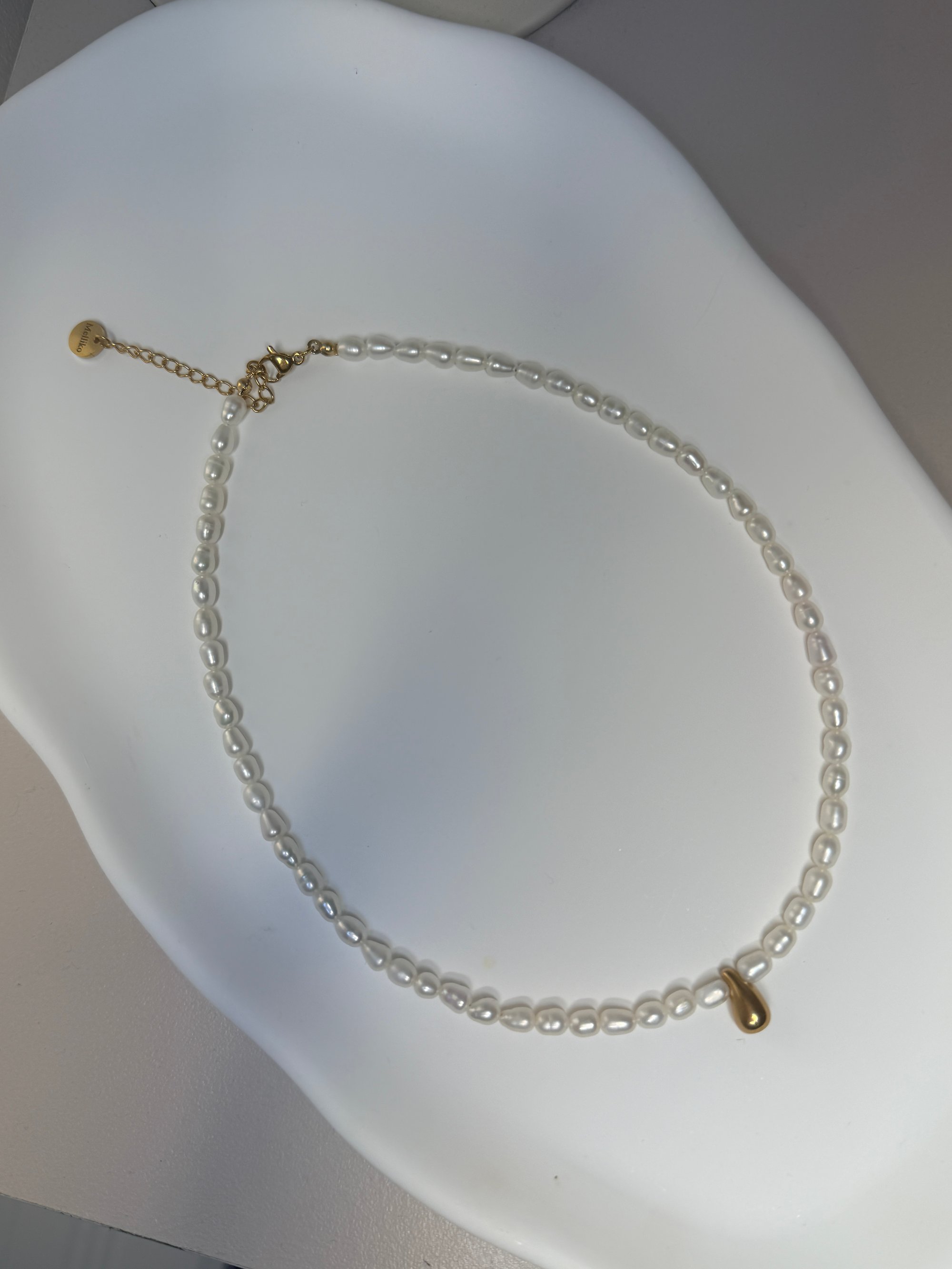 A delicate necklace made of freshwater pearls. The centerpiece features a teardrop-shaped pendant made of surgical steel. The clasp and extension are also made of surgical steel.