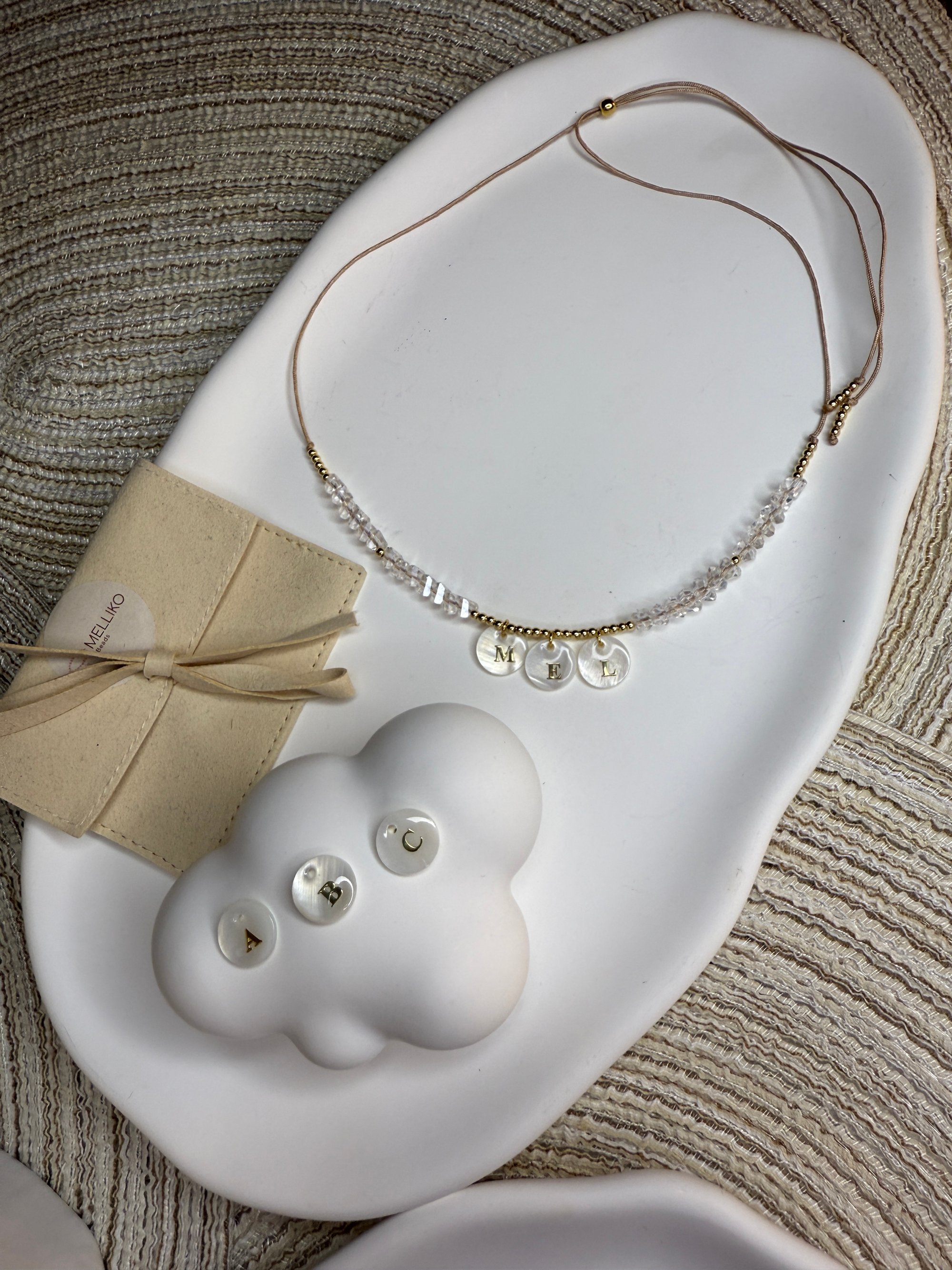 Our custom necklaces are made with transparent beads that catch and reflect sunlight beautifully 🌞 – creating a soft, radiant shimmer with every move.