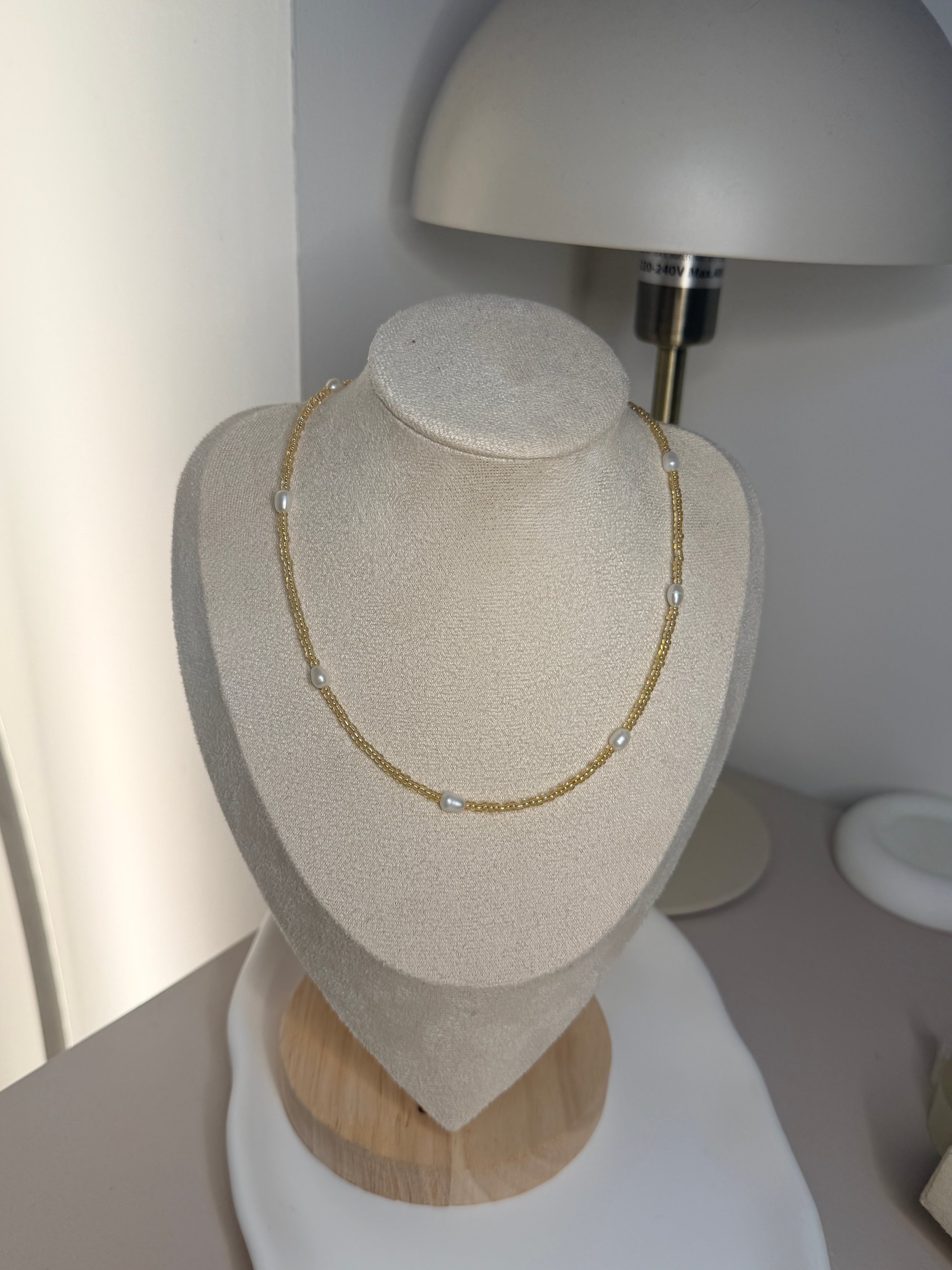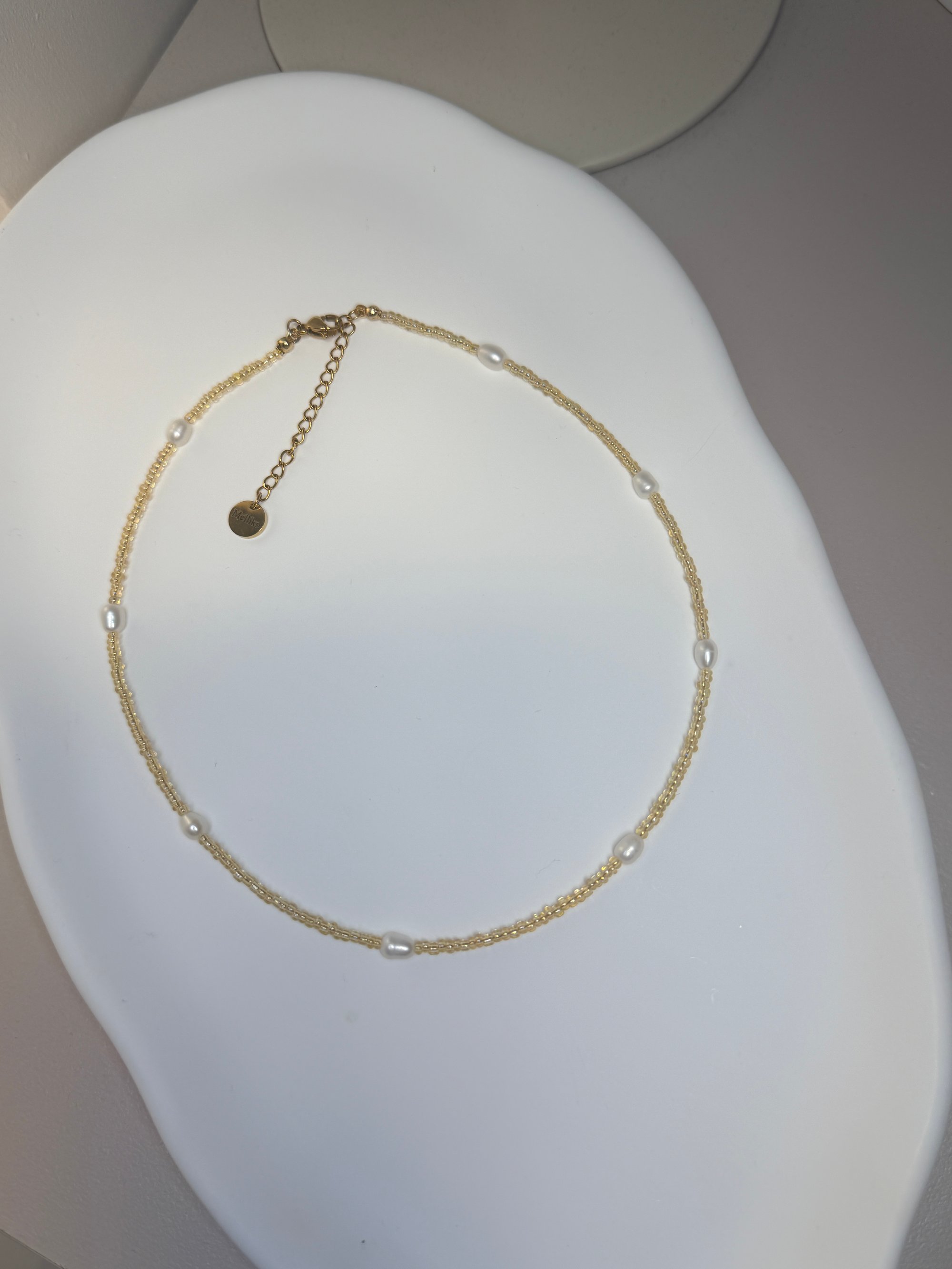 Delikatny naszyjnik wykonany ze szklanych lekko złotych połyskujących koralików w połączeniu z z perełami słodkowodnymi . Zapięcie oraz przedłużka ze stali chirurgicznej.