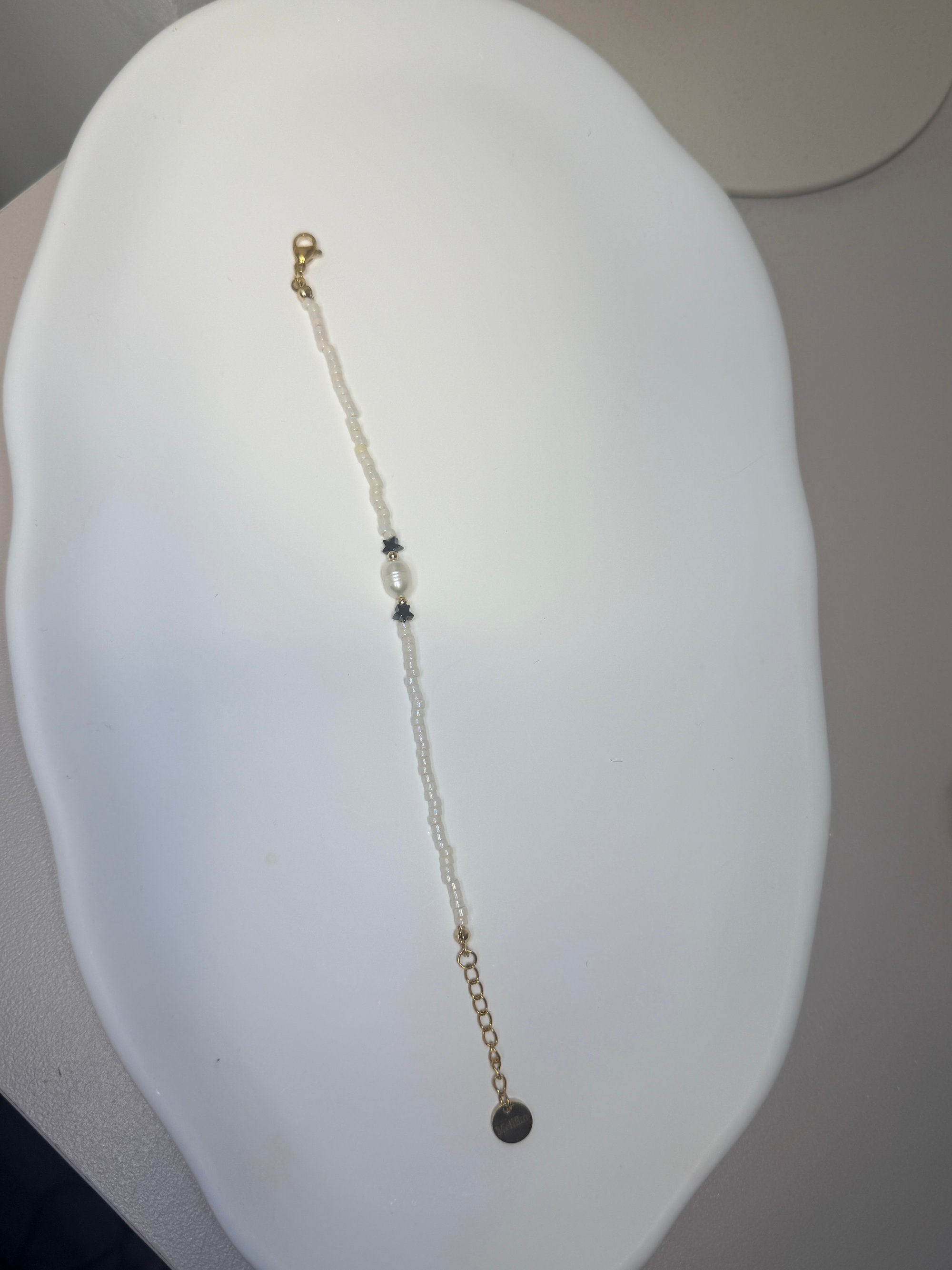 A delicate bracelet made of bright, shimmering glass beads combined with freshwater pearls and hematyr whistles. The clasp and extension are made of surgical steel.