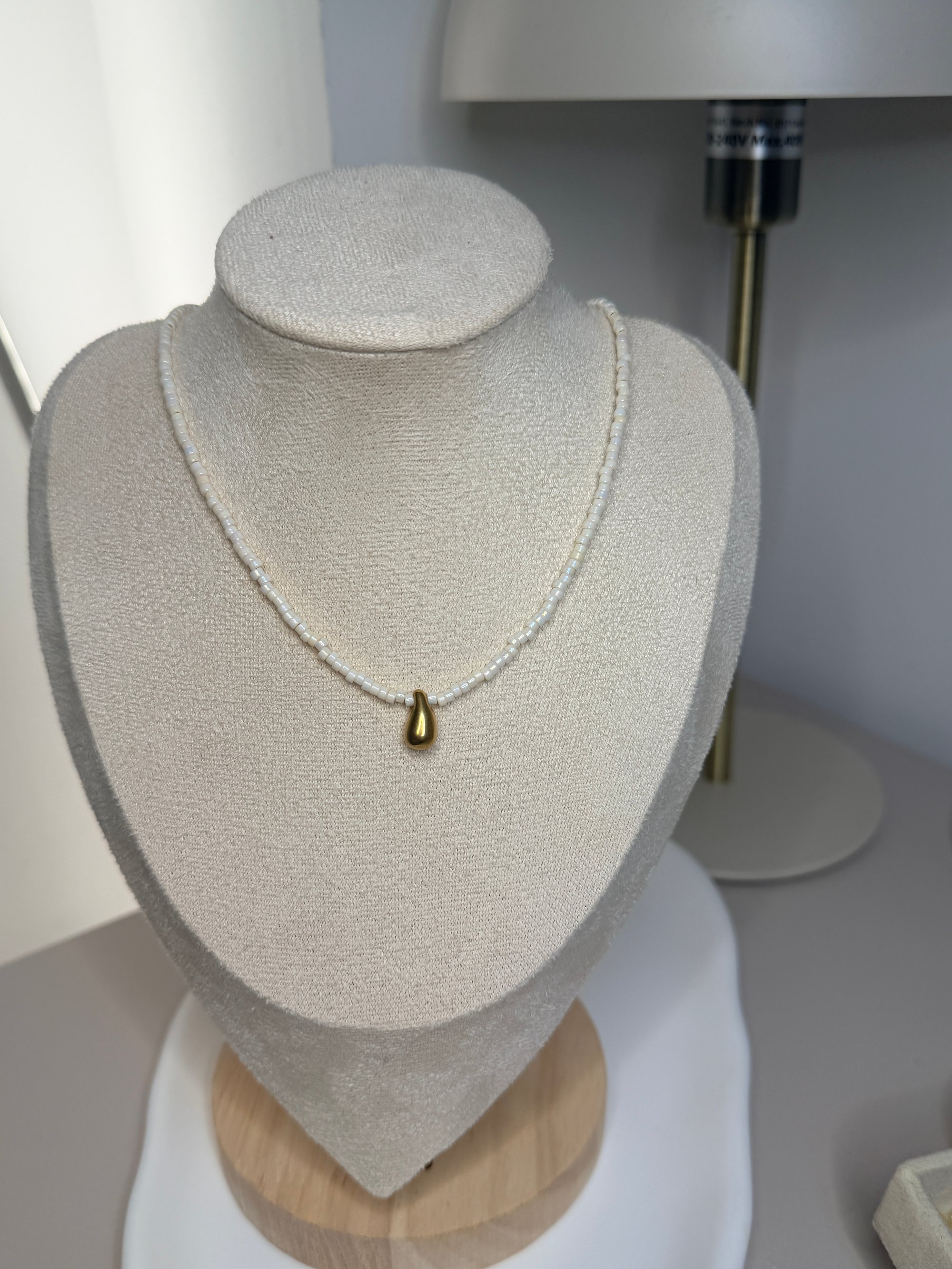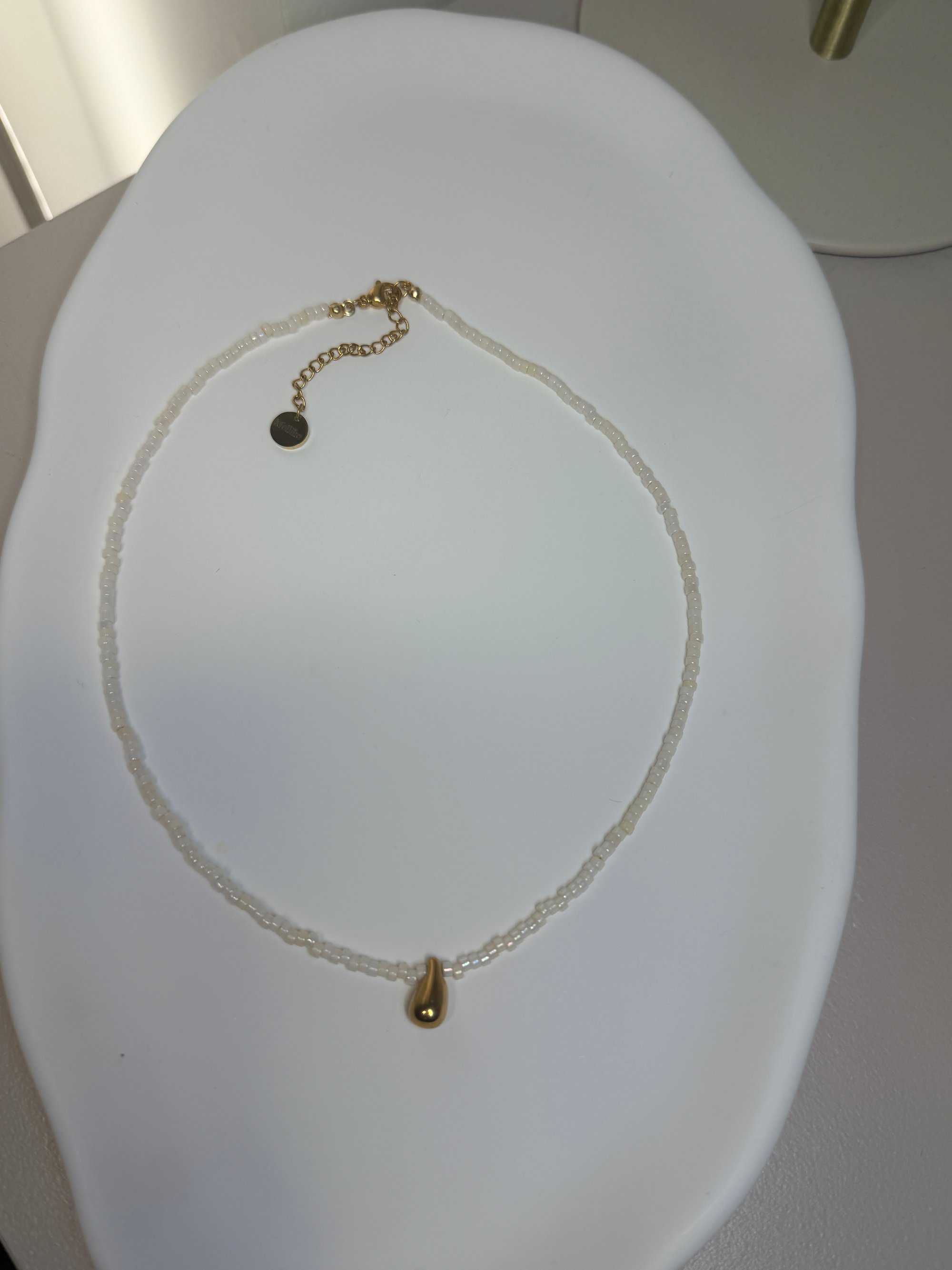 Delikatny ręcznie robiony naszyjnik wykonany z drobnych, lekko połyskujących szklanych koralików w jasnym odcieniu. Na środku zawieszka w kształcie łezki ze stali chirurgicznej. Zapięcie oraz przedłużka również ze stali chirurgicznej.