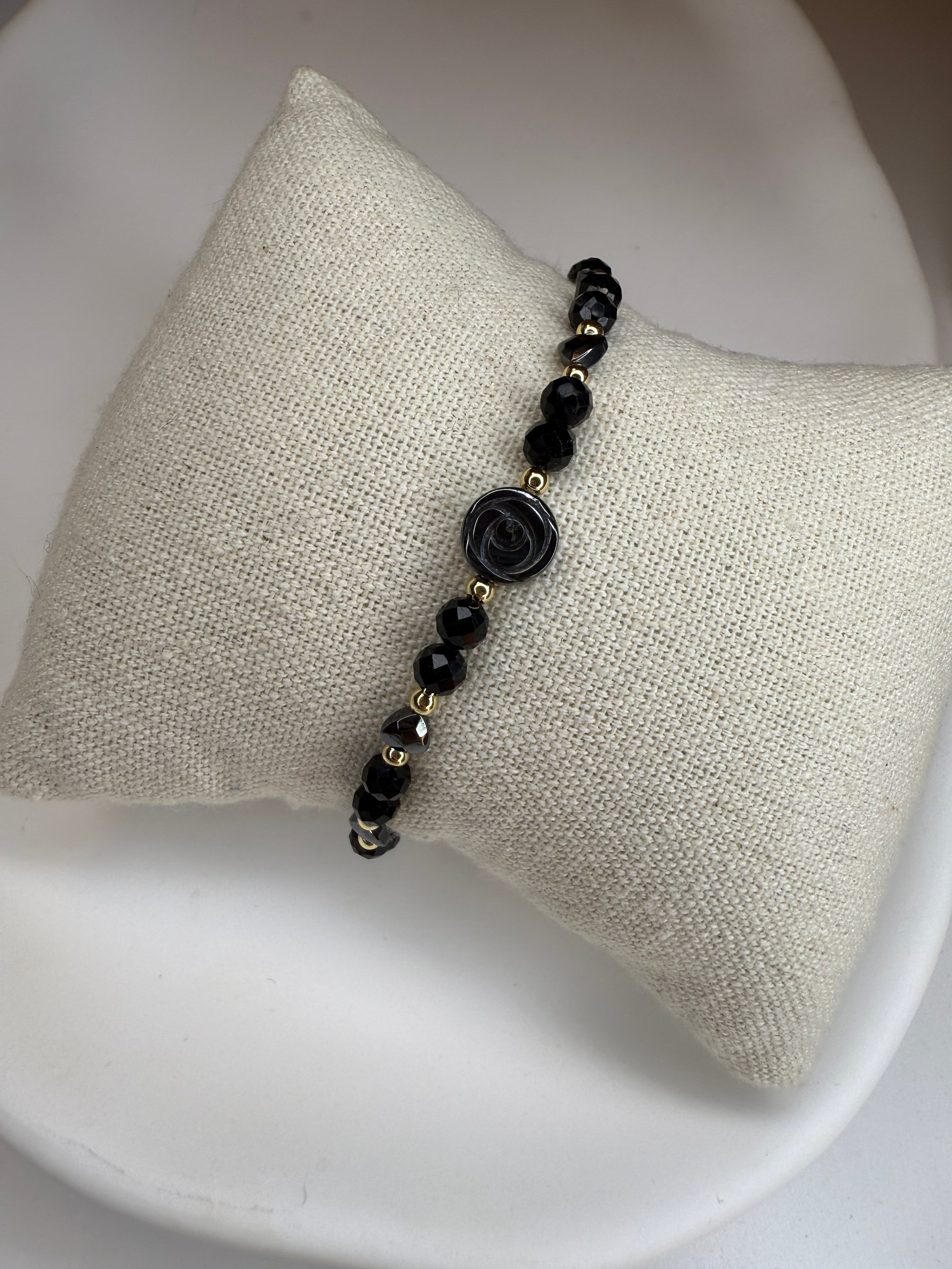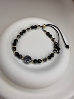 Bransoletka z hematytu i turmalinu na czarnym, regulowanym sznureczku to subtelny, a jednocześnie wyjątkowy amulet szczęścia.