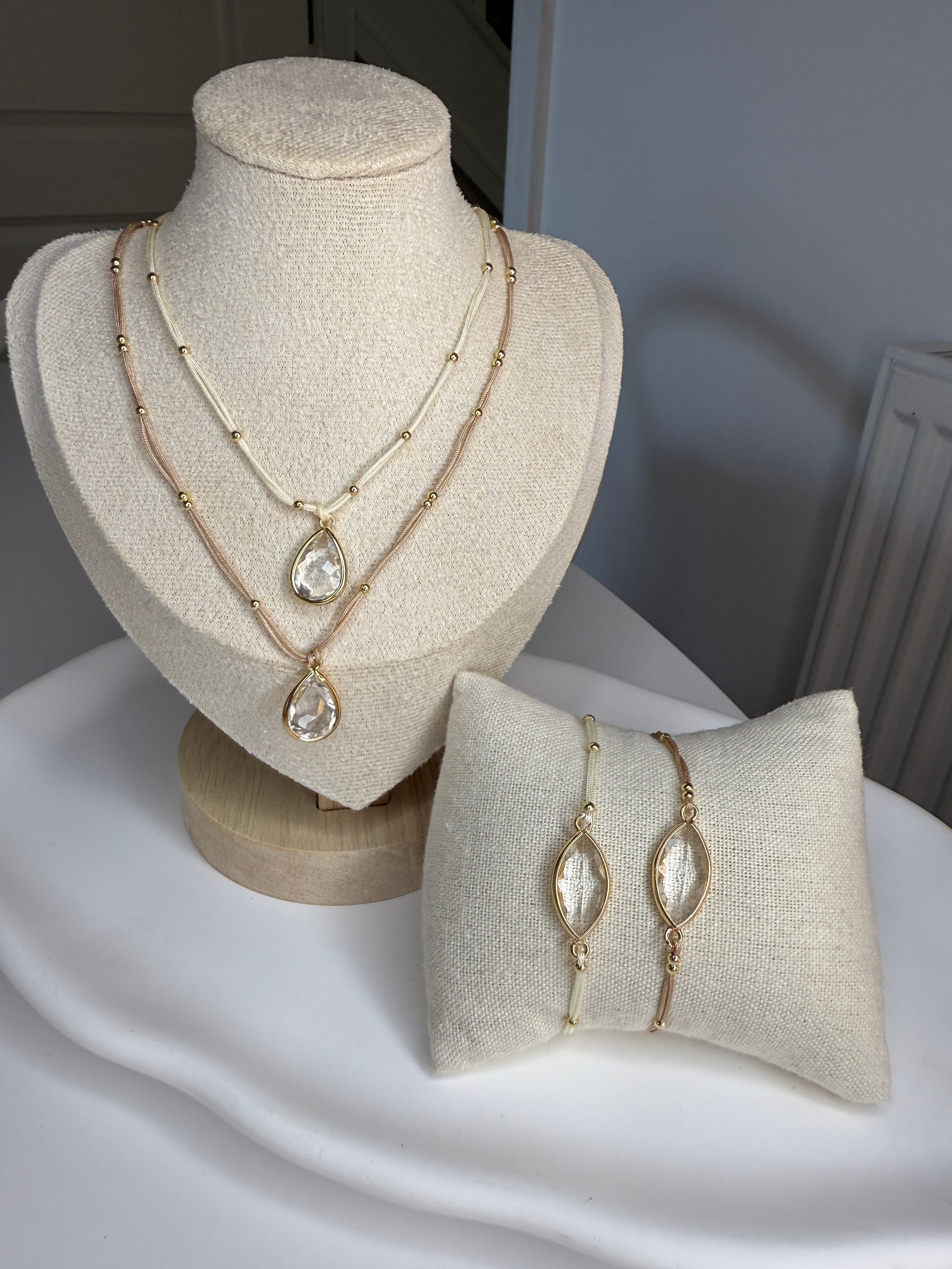 A delicate necklace with a transparent gemstone on a double cord (available in 3 colors). Adorned with tiny gold beads that you can freely move, allowing you to create a slightly different design each time. The length is adjustable – which means you can wear it as a classic necklace or as a choker, depending on how you set the clasp