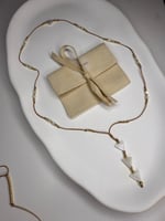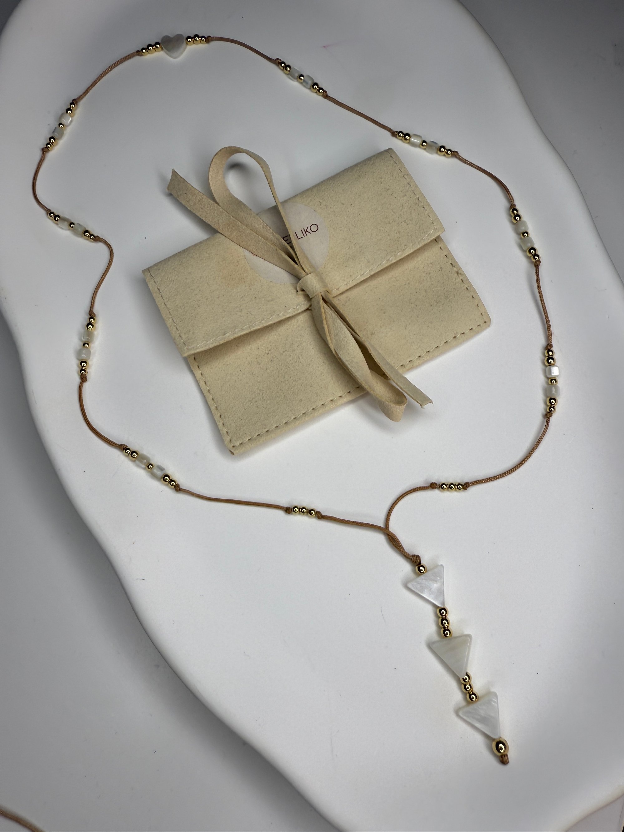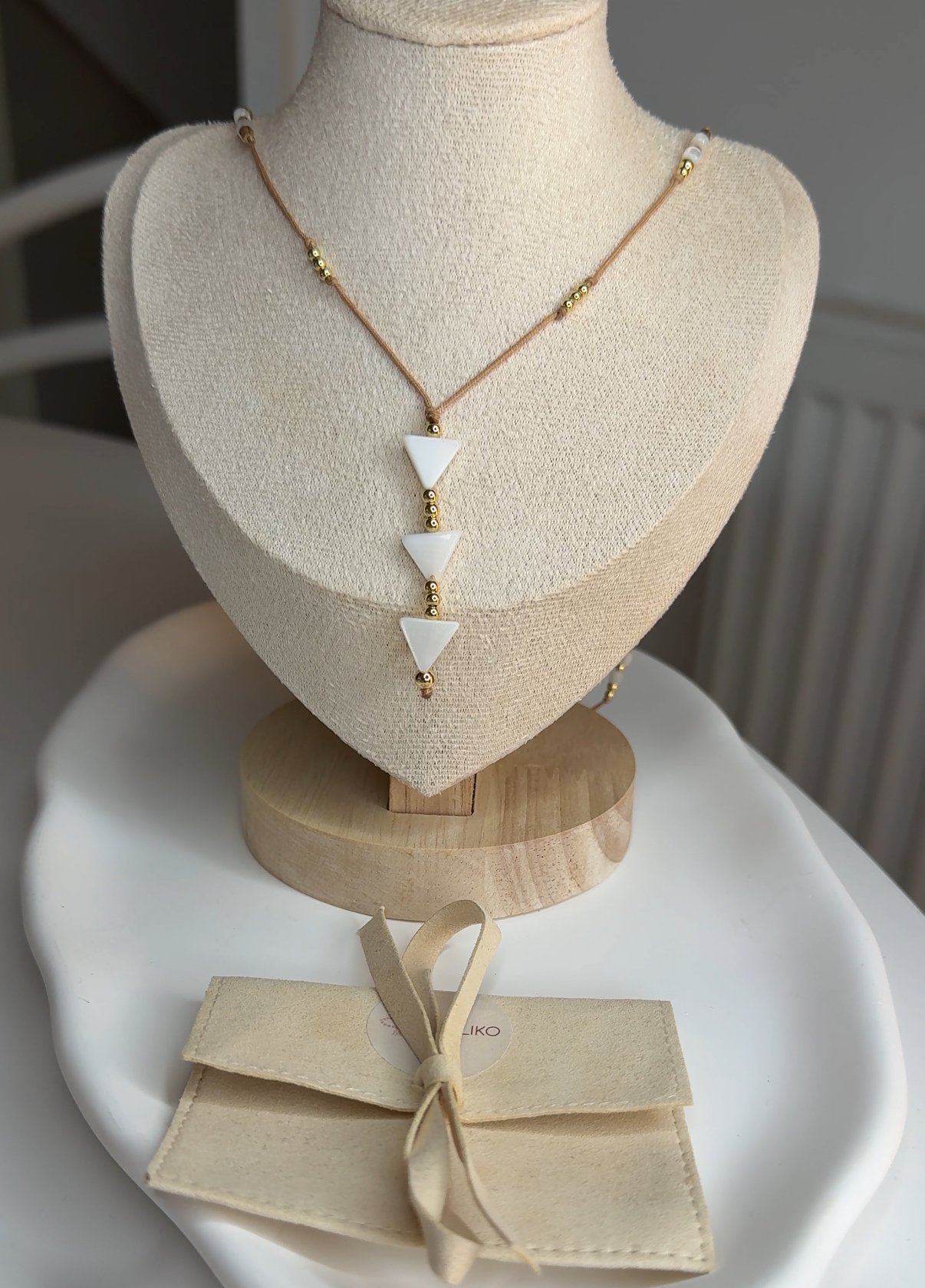 This necklace is an elegant and versatile accessory that can be worn in two ways. On one side, it features three cascading triangles that gracefully align at the bust, adding subtle elegance and a modern touch. The golden accents and delicate cord lend it lightness and finesse. When reversed, the necklace reveals a heart motif, creating a minimalist and stylish design that perfectly fits contemporary trends. Its slip-on design makes it not only visually striking but also highly practical.